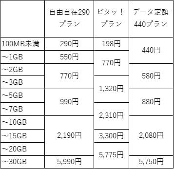 音声通話付きSIM(docomo回線)が290円~、データ通信専用SIMが198円と最安値級の価格が特長なのですが、まとめると以下の通りになります。